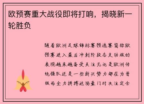 欧预赛重大战役即将打响,揭晓新一轮胜负