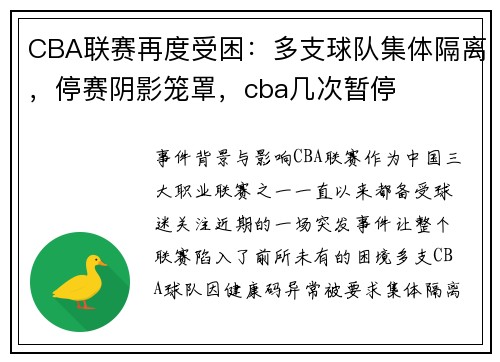 此次多支球队集体隔离事件虽然给CBA联赛带来了短期困扰,但也为未来的改进提供了契机。只要各方能够团结一心,科学防疫,CBA联赛必将迎来更加光明的未来。