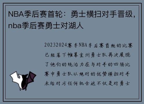 2023-2024赛季NBA季后赛首轮的比赛已经落下帷幕,金州勇士队再次展现了他们的统治力。在与对手的四场比赛中,勇士队以绝对的优势横扫对手,未给对方任何机会。这不仅是对勇士队实力的肯定,更是对他们团队协作和战术执行能力的完美诠释。