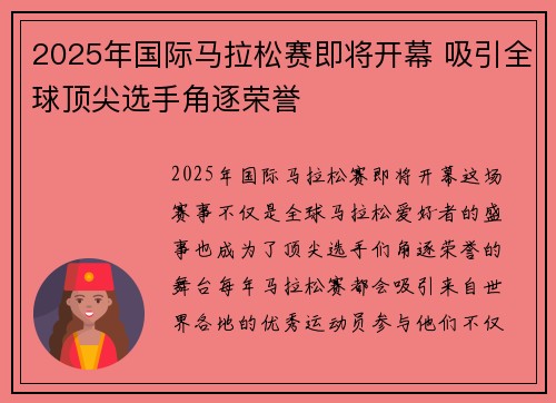 2025年国际马拉松赛即将开幕 吸引全球顶尖选手角逐荣誉