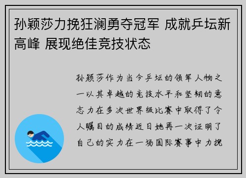孙颖莎力挽狂澜勇夺冠军 成就乒坛新高峰 展现绝佳竞技状态