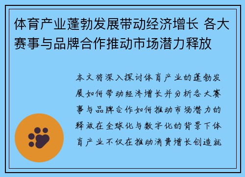本文将深入探讨体育产业的蓬勃发展如何带动经济增长,并分析各大赛事与品牌合作如何推动市场潜力的释放。在全球化与数字化的背景下,体育产业不仅在推动消费增长、创造就业机会方面发挥着重要作用,还通过赛事品牌合作深化了产业链的拓展与资源配置优化。通过四个方面的详细阐述,本文将呈现体育产业的多重价值,并总结其对...