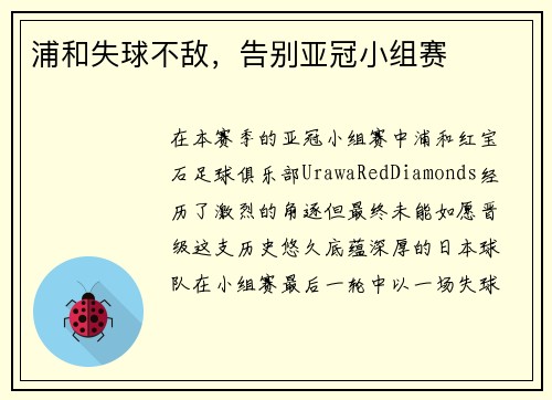在本赛季的亚冠小组赛中,浦和红宝石足球俱乐部(UrawaRedDiamonds)经历了激烈的角逐,但最终未能如愿晋级。这支历史悠久、底蕴深厚的日本球队,在小组赛最后一轮中以一场失球的比赛告别了亚冠,留下了众多球迷的惋惜。