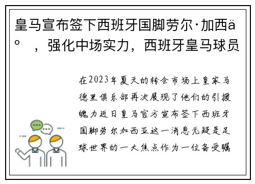 在2023年夏天的转会市场上,皇家马德里俱乐部再次展现了他们的引援魄力。近日,皇马官方宣布签下西班牙国脚劳尔·加西亚,这一消息无疑是足球世界的一大焦点。作为一位备受瞩目的中场新星,劳尔·加西亚的加盟将为皇马的中场实力带来显著提升,也为球队的未来发展注入了新的活力。 劳尔·加西亚:一位冉冉升起的中场新...