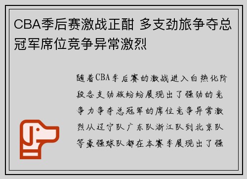 CBA季后赛激战正酣 多支劲旅争夺总冠军席位竞争异常激烈