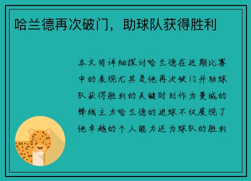 本文将详细探讨哈兰德在近期比赛中的表现,尤其是他再次破门并助球队获得胜利的关键时刻。作为曼城的锋线主力,哈兰德的进球不仅展现了他卓越的个人能力,还为球队的胜利贡献了至关重要的力量。文章从四个方面展开,分析哈兰德破门的背景、进球过程、对球队的意义以及他个人的表现等内容。这一进球的背后不仅是哈兰德的天赋...