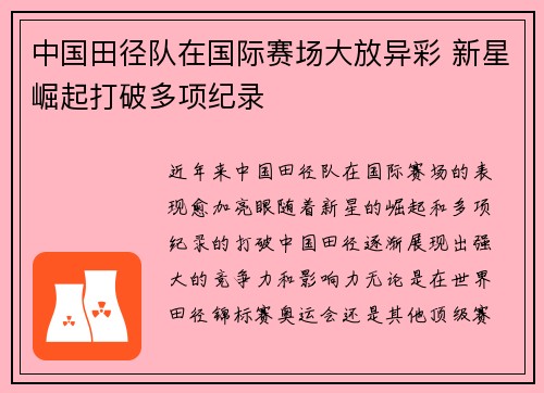 近年来,中国田径队在国际赛场的表现愈加亮眼,随着新星的崛起和多项纪录的打破,中国田径逐渐展现出强大的竞争力和影响力。无论是在世界田径锦标赛、奥运会,还是其他顶级赛事中,中国运动员都以出色的成绩和顽强的拼搏精神吸引了全球的关注。文章将从四个方面对中国田径队在国际赛场的出色表现进行详细阐述,分析新星的崛...