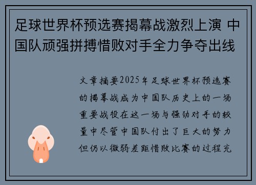 足球世界杯预选赛揭幕战激烈上演 中国队顽强拼搏惜败对手全力争夺出线名额